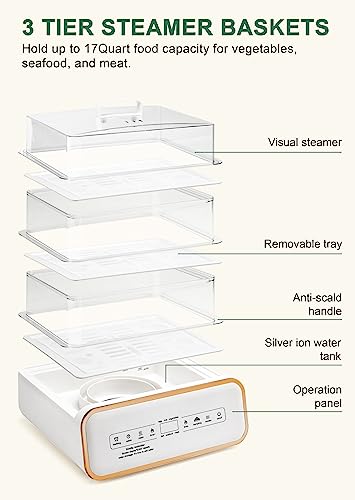 Specification: SUSTEAS Food Steamer for Cooking – 17QT Vegetable Steamer with 24H Booking & 60Min Timer, Electric Steamer with Digital Display and 3 Tier Stackable Trays, Auto Shut-Off & Boil Dry Protection